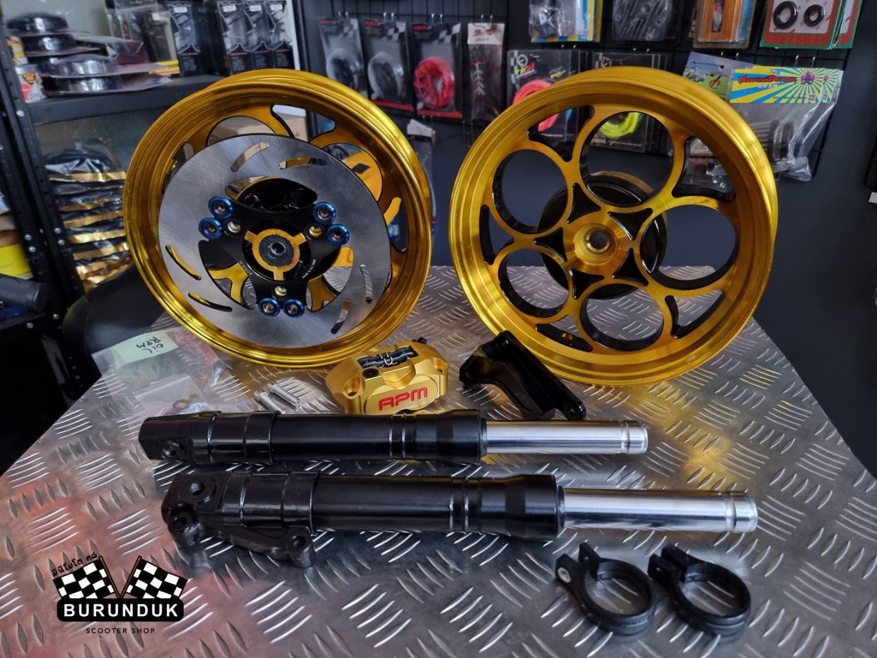 КОМПЛЕКТАЦИЯ: TWPO ЛИТЫЕ ДИСКИ золотые [к дисковым тормозам], CNC КРОНШТЕЙН ДЛЯ СУППОРТА 200 мм, RPM racing ТОРМОЗНОЙ СУППОРТ, АМОРТИЗАТОРЫ ПЕРЕДНИЕ [ПЕРЬЯ] 370 мм, ТОРМОЗНОЙ ДИСК 200 мм
