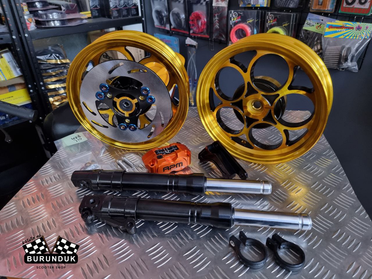 КОМПЛЕКТАЦИЯ: TWPO ЛИТЫЕ ДИСКИ золотые [к дисковым тормозам], CNC КРОНШТЕЙН ДЛЯ СУППОРТА 200 мм, RPM racing ТОРМОЗНОЙ СУППОРТ, АМОРТИЗАТОРЫ ПЕРЕДНИЕ [ПЕРЬЯ] 370 мм, ТОРМОЗНОЙ ДИСК 200 мм