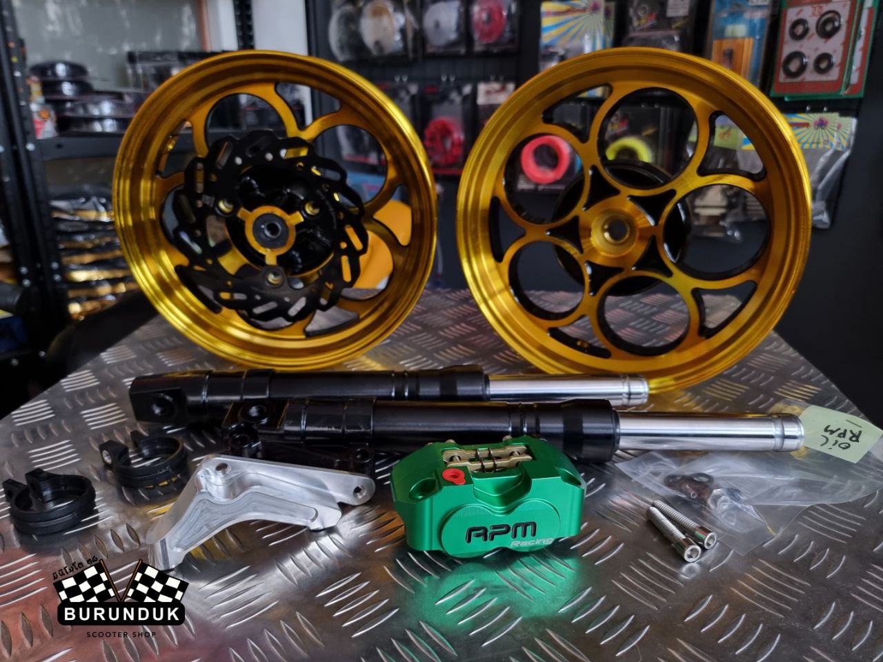 КОМПЛЕКТАЦИЯ: TWPO ЛИТЫЕ ДИСКИ золотые [к дисковым тормозам], CNC КРОНШТЕЙН ДЛЯ СУППОРТА 160 мм, RPM racing ТОРМОЗНОЙ СУППОРТ, АМОРТИЗАТОРЫ ПЕРЕДНИЕ [ПЕРЬЯ] 370 мм, KN ТОРМОЗНОЙ ДИСК 160 мм