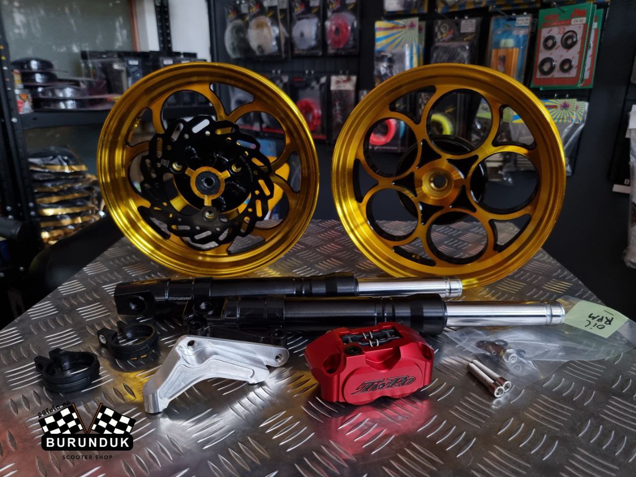 КОМПЛЕКТАЦИЯ: TWPO ЛИТЫЕ ДИСКИ золотые [к дисковым тормозам], CNC КРОНШТЕЙН ДЛЯ СУППОРТА 160 мм, TWPO ТОРМОЗНОЙ СУППОРТ, АМОРТИЗАТОРЫ ПЕРЕДНИЕ [ПЕРЬЯ] 370 мм, KN ТОРМОЗНОЙ ДИСК 160 мм