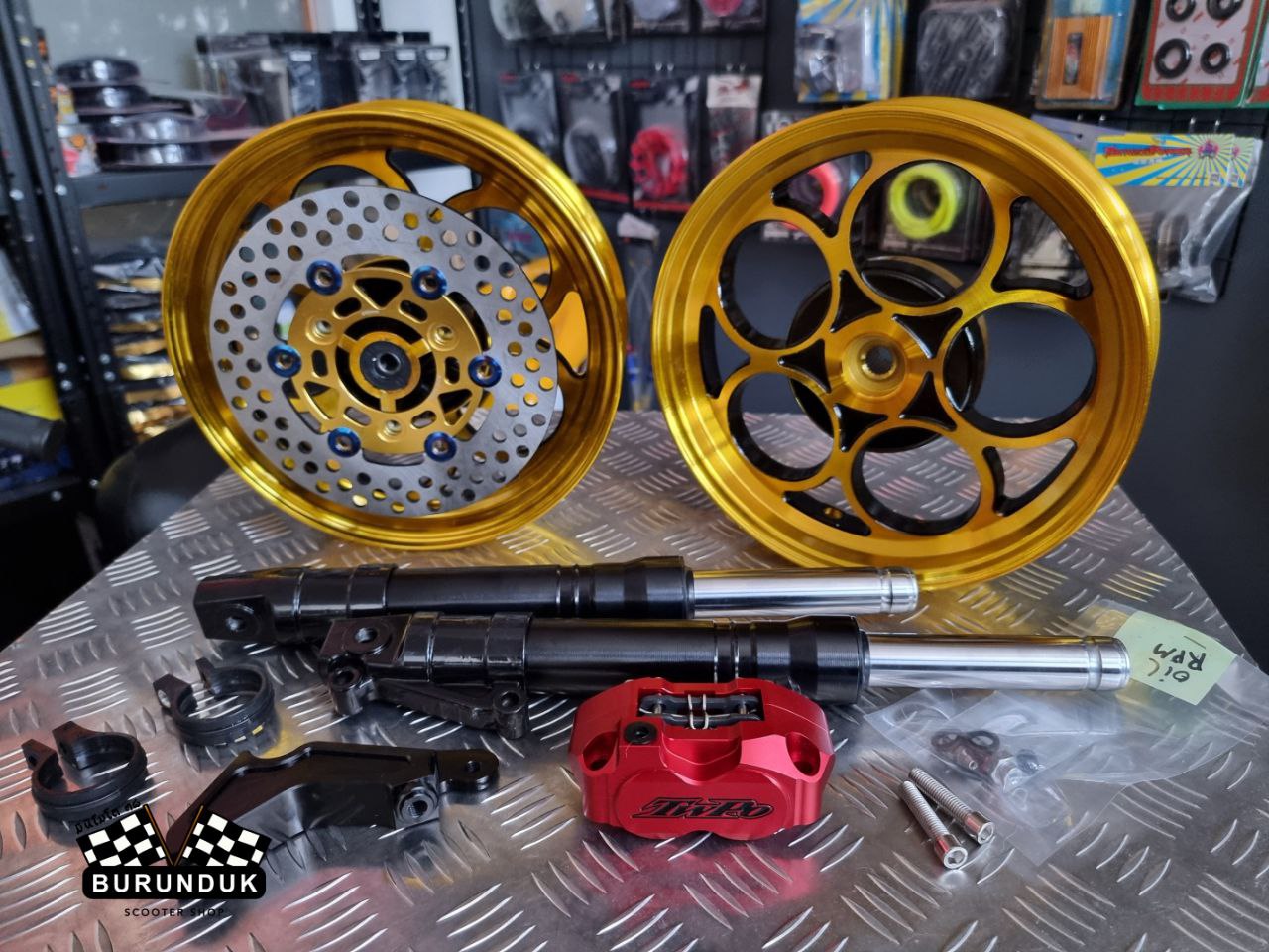 КОМПЛЕКТАЦИЯ: TWPO ЛИТЫЕ ДИСКИ золотые [к дисковым тормозам], CNC КРОНШТЕЙН ДЛЯ СУППОРТА 200 мм, TWPO ТОРМОЗНОЙ СУППОРТ, АМОРТИЗАТОРЫ ПЕРЕДНИЕ [ПЕРЬЯ] 370 мм, RPM RACING ТОРМОЗНОЙ ДИСК 200 мм