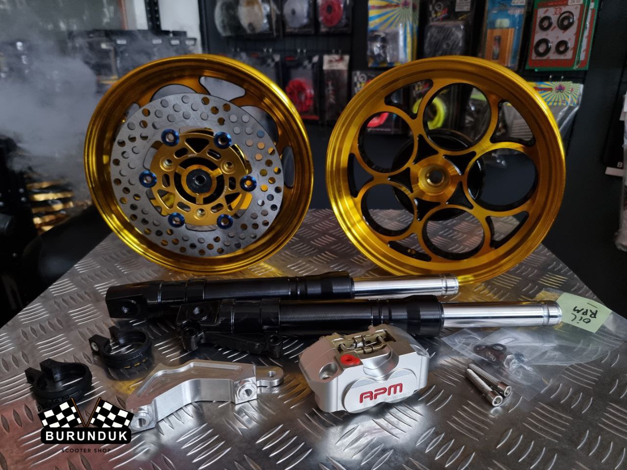 КОМПЛЕКТАЦИЯ: TWPO ЛИТЫЕ ДИСКИ золотые [к дисковым тормозам], CNC КРОНШТЕЙН ДЛЯ СУППОРТА 200 мм, RPM racing ТОРМОЗНОЙ СУППОРТ , АМОРТИЗАТОРЫ ПЕРЕДНИЕ [ПЕРЬЯ] 370 мм, RPM RACING ТОРМОЗНОЙ ДИСК 200 мм