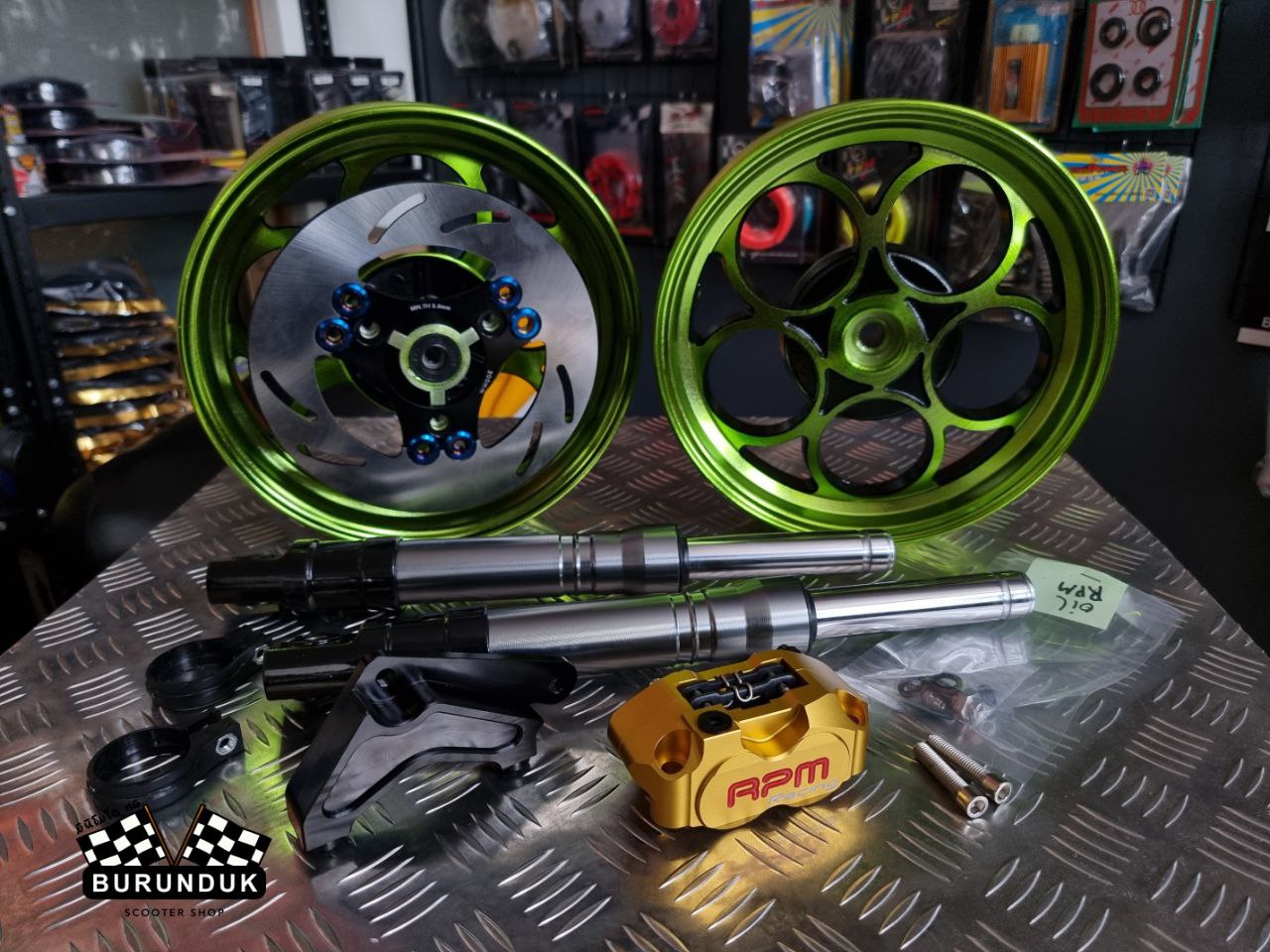 КОМПЛЕКТАЦИЯ: TWPO ЛИТЫЕ ДИСКИ зелёные [к дисковым тормозам], CNC КРОНШТЕЙН ДЛЯ СУППОРТА 200 мм, RPM racing ТОРМОЗНОЙ СУППОРТ, АМОРТИЗАТОРЫ ПЕРЕДНИЕ [ПЕРЬЯ] 370 мм, ТОРМОЗНОЙ ДИСК 200 мм