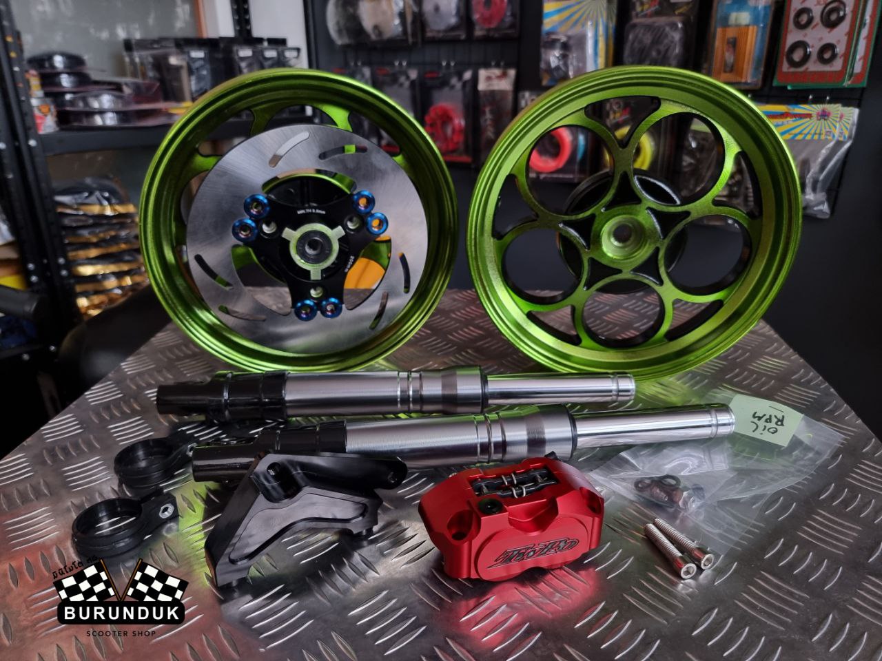 КОМПЛЕКТАЦИЯ: TWPO ЛИТЫЕ ДИСКИ зелёные [к дисковым тормозам], CNC КРОНШТЕЙН ДЛЯ СУППОРТА 200 мм, TWPO ТОРМОЗНОЙ СУППОРТ, АМОРТИЗАТОРЫ ПЕРЕДНИЕ [ПЕРЬЯ] 370 мм, ТОРМОЗНОЙ ДИСК 200 мм