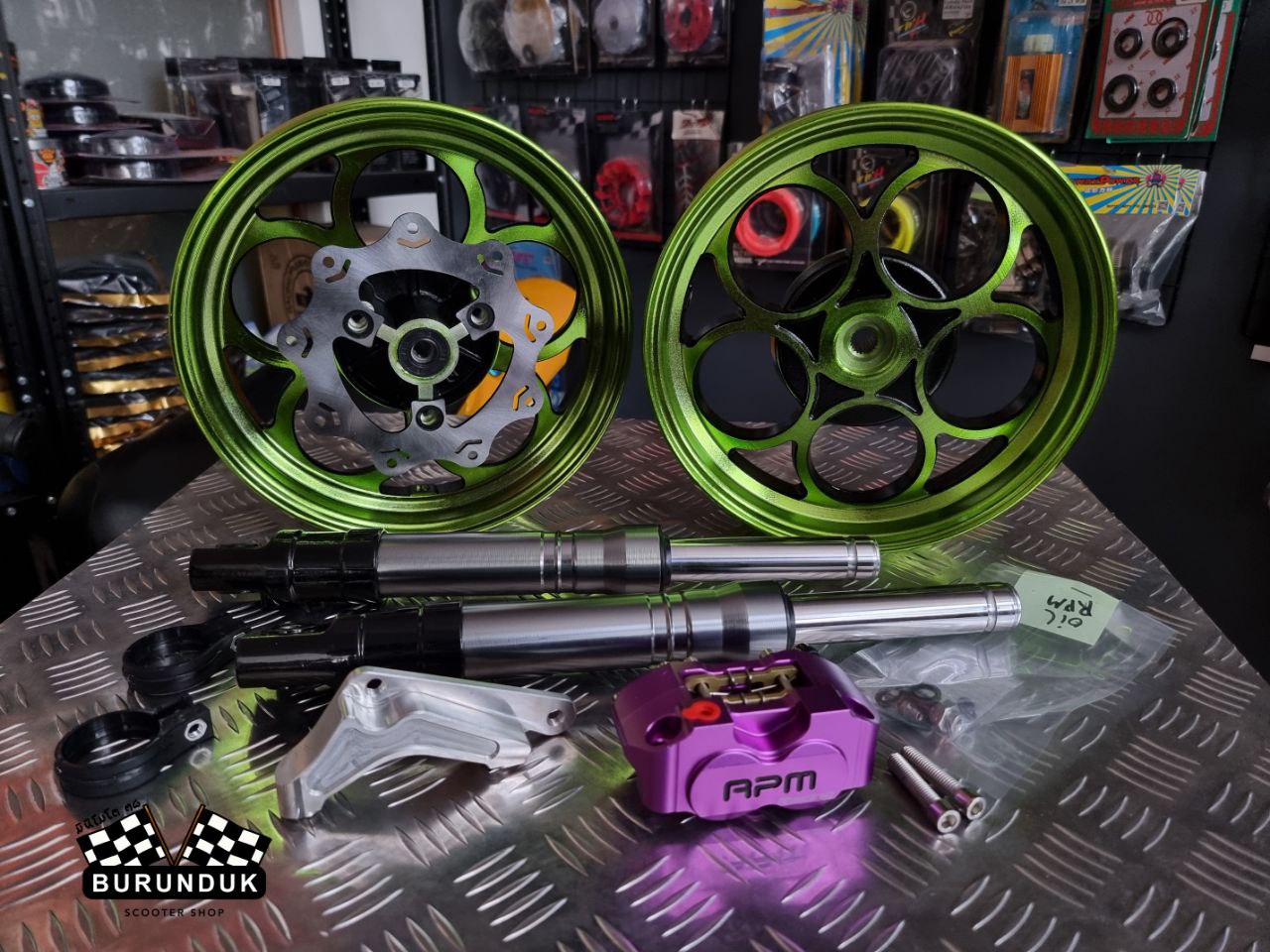 КОМПЛЕКТАЦИЯ: TWPO ЛИТЫЕ ДИСКИ зелёные [к дисковым тормозам], CNC КРОНШТЕЙН ДЛЯ СУППОРТА 160 мм, RPM racing ТОРМОЗНОЙ СУППОРТ, АМОРТИЗАТОРЫ ПЕРЕДНИЕ [ПЕРЬЯ] 370 мм, ТОРМОЗНОЙ ДИСК 160 мм