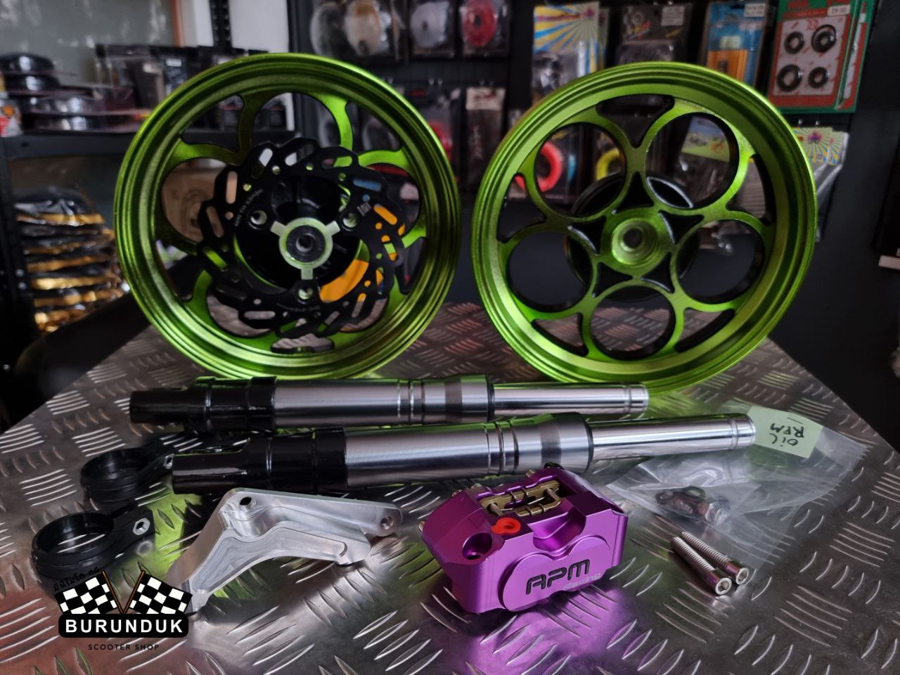 КОМПЛЕКТАЦИЯ: TWPO ЛИТЫЕ ДИСКИ зелёные [к дисковым тормозам], CNC КРОНШТЕЙН ДЛЯ СУППОРТА 160 мм, RPM racing ТОРМОЗНОЙ СУППОРТ, АМОРТИЗАТОРЫ ПЕРЕДНИЕ [ПЕРЬЯ] 370 мм, KN ТОРМОЗНОЙ ДИСК 160 мм