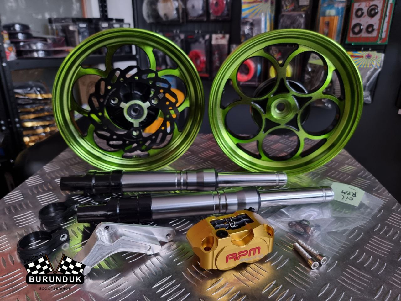 КОМПЛЕКТАЦИЯ: TWPO ЛИТЫЕ ДИСКИ зелёные [к дисковым тормозам], CNC КРОНШТЕЙН ДЛЯ СУППОРТА 160 мм, RPM racing ТОРМОЗНОЙ СУППОРТ, АМОРТИЗАТОРЫ ПЕРЕДНИЕ [ПЕРЬЯ] 370 мм, KN ТОРМОЗНОЙ ДИСК 160 мм