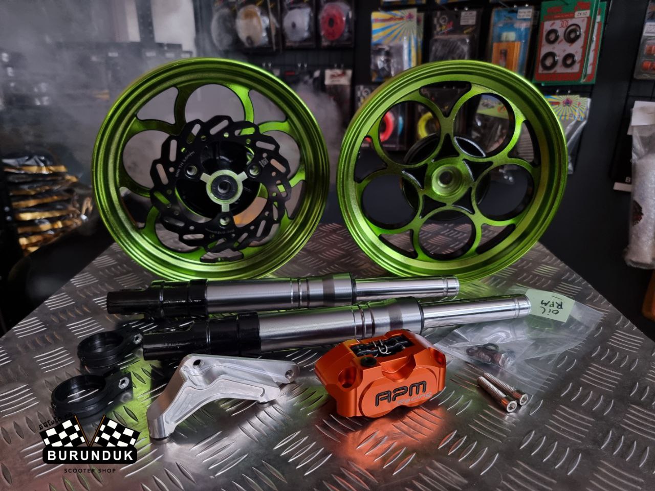 КОМПЛЕКТАЦИЯ: TWPO ЛИТЫЕ ДИСКИ зелёные [к дисковым тормозам], CNC КРОНШТЕЙН ДЛЯ СУППОРТА 160 мм, RPM racing ТОРМОЗНОЙ СУППОРТ, АМОРТИЗАТОРЫ ПЕРЕДНИЕ [ПЕРЬЯ] 370 мм, KN ТОРМОЗНОЙ ДИСК 160 мм
