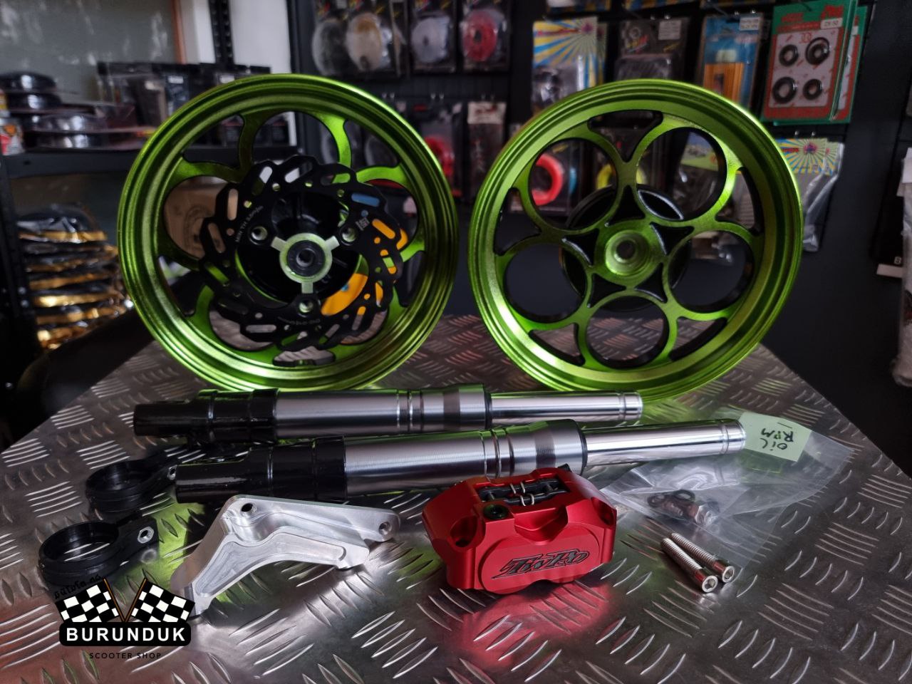 КОМПЛЕКТАЦИЯ: TWPO ЛИТЫЕ ДИСКИ зелёные [к дисковым тормозам], CNC КРОНШТЕЙН ДЛЯ СУППОРТА 160 мм, TWPO ТОРМОЗНОЙ СУППОРТ, АМОРТИЗАТОРЫ ПЕРЕДНИЕ [ПЕРЬЯ] 370 мм, KN ТОРМОЗНОЙ ДИСК 160 мм